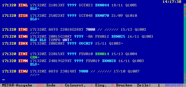 Es werden METAR bzw. SPECI-Meldungen ausgegeben. Bei SPECI-Meldungen wird die