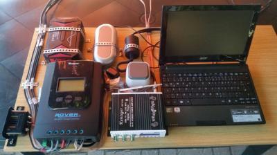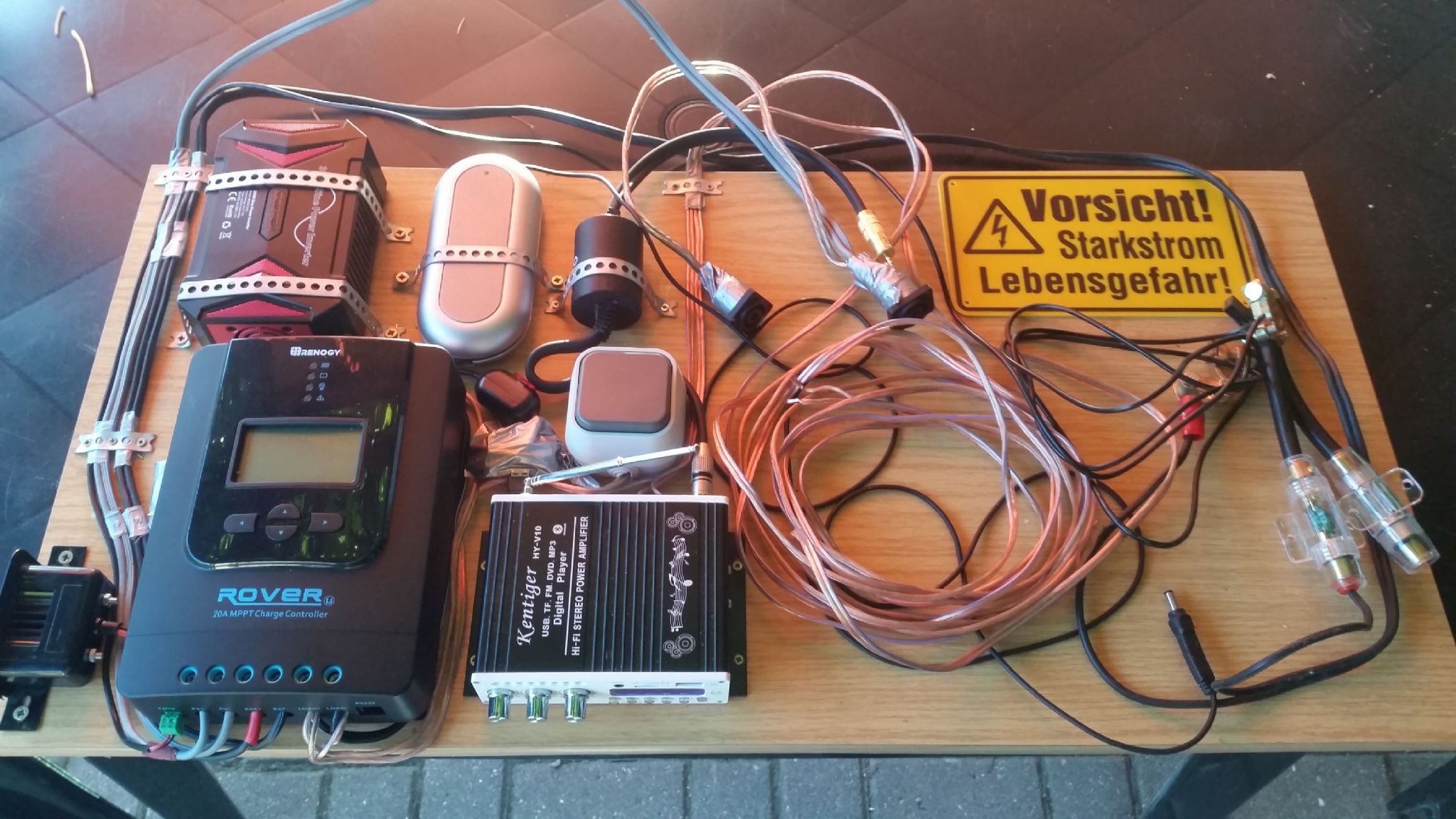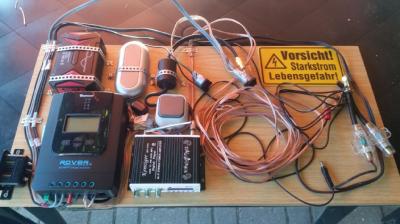 Grundplatte mit Laderegler, 300W-Wechselrichter, 19V-Adapter für Nootebook, 12V-Verstärker, Solarmodul- und Batterieanschlusskabel.