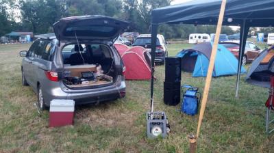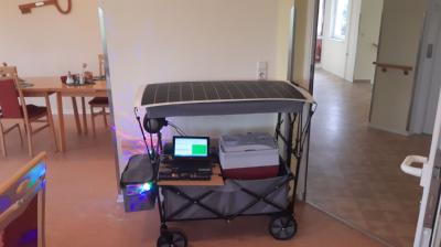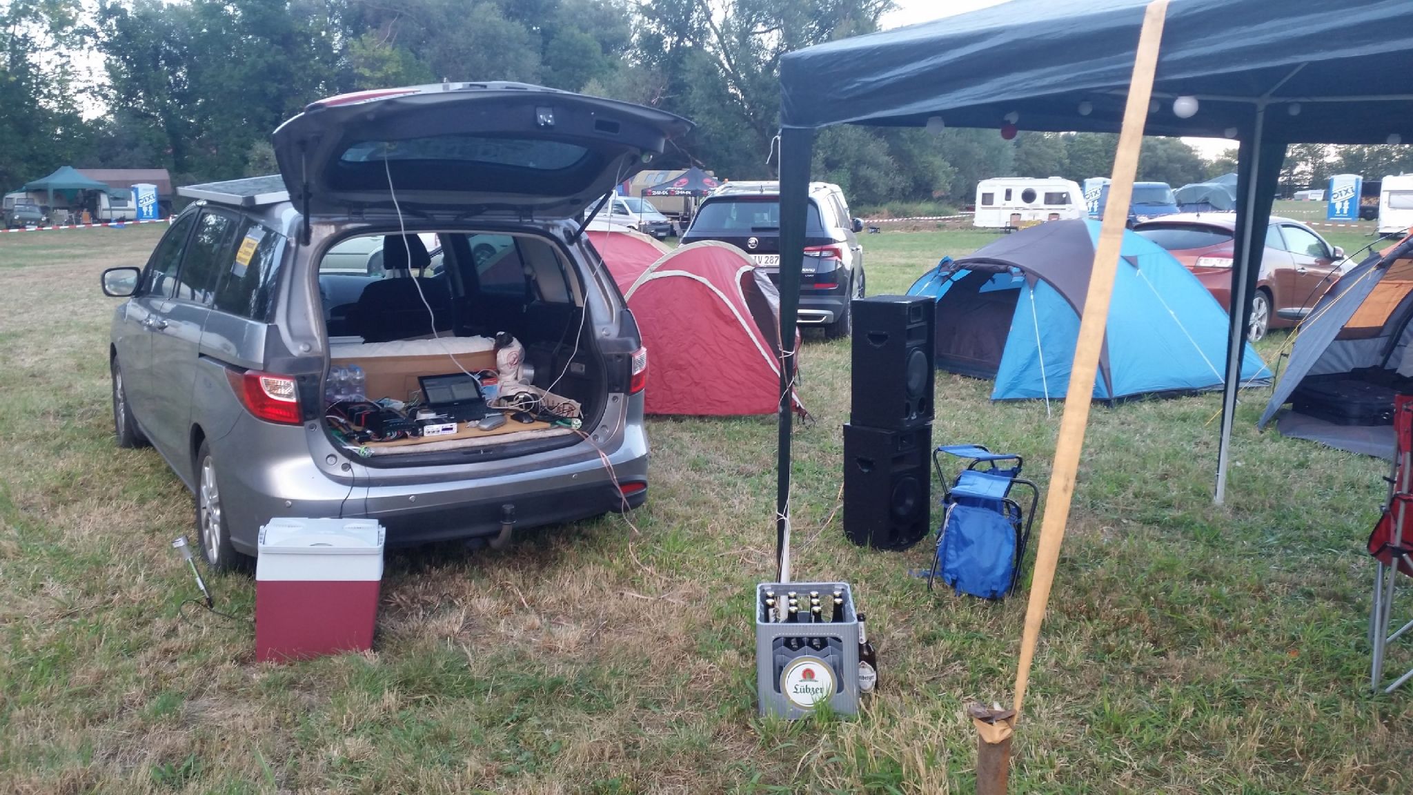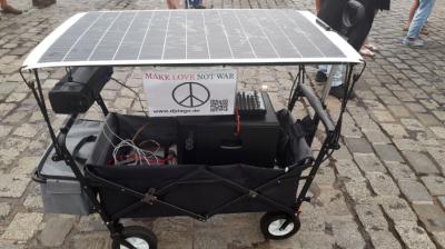 Auf dem Pferdemarkt, zwei 150W-Peek Module liegen auf dem Autodach, der Strom reicht tagsüber zum Betreiben der Kühlbox.