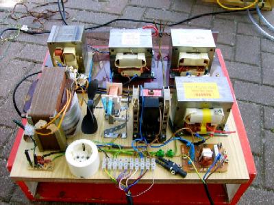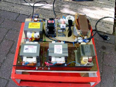 durch einen Microwellenlüfter gekühlt. Über ein Lastschütz werden die Trafos